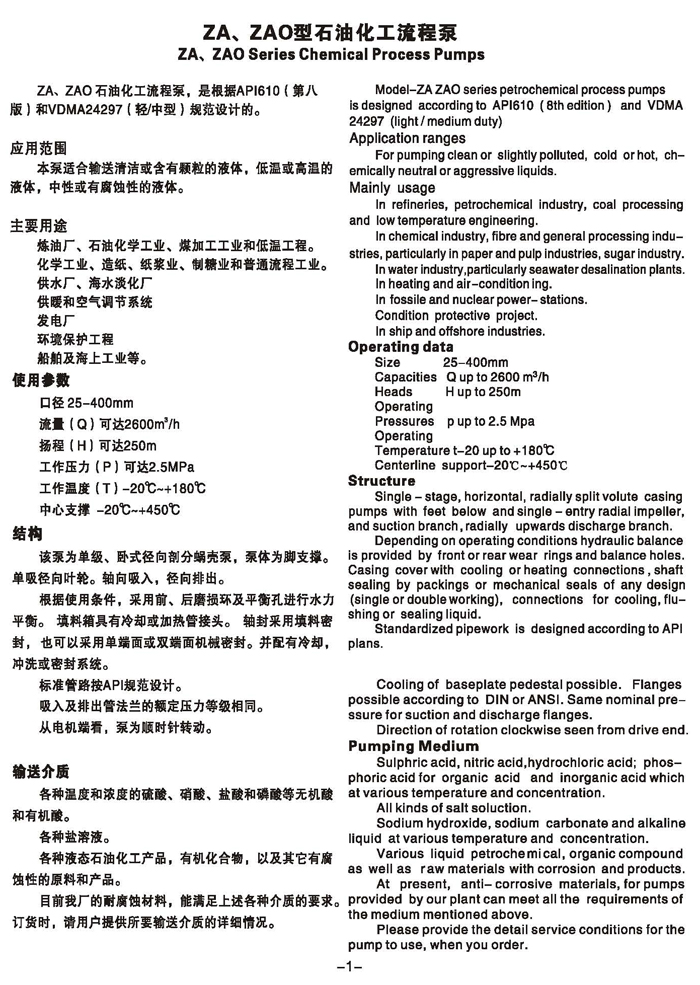 ZA、ZAO石油化工流程泵,是根据AP1610和VDMA24297(轻/中型)规范设计的。 应用范围:本泵适合输送清洁或含有颗粒的液体,低温或高温的液体,中性或有腐蚀性的液体。 主要用途:炼油厂、石油化工学工业、煤加工工业和低温工程化学工业、造纸、纸浆业、制糖业和普通流程工业供水厂、海水淡化厂供...